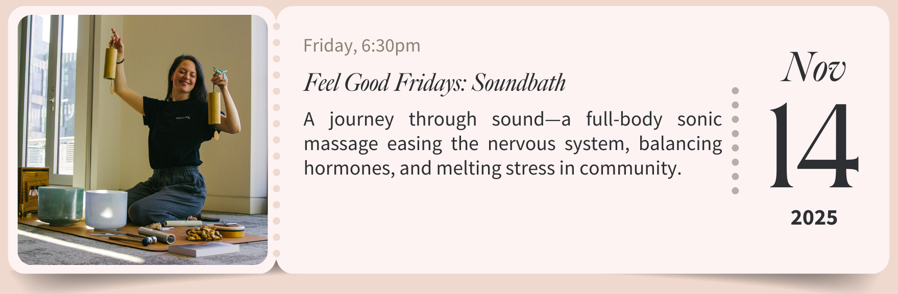 Ease into your weekend with a restorative Soundbath at The Hearth’s Feel Good Fridays. This immersive experience uses the healing power of sound—through voice, crystal alchemy singing bowls, chimes, and other instruments, to guide you into deep relaxation and balance. Sound doesn’t just reach your ears, it resonates through your whole body, creating harmony within your cells, calming your nervous system, and helping you return to a natural state of ease.