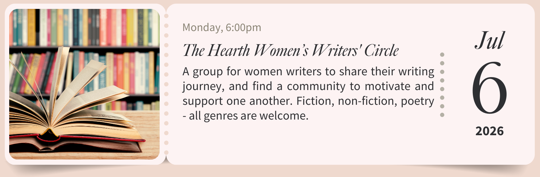 Whether you’re working on fiction, non-fiction, or poetry, the circle is open to anyone seeking a supportive community to motivate, inspire, and encourage their writing goals. Sessions are monthly and run in two parts, combining both creative and sharing-focused time.
