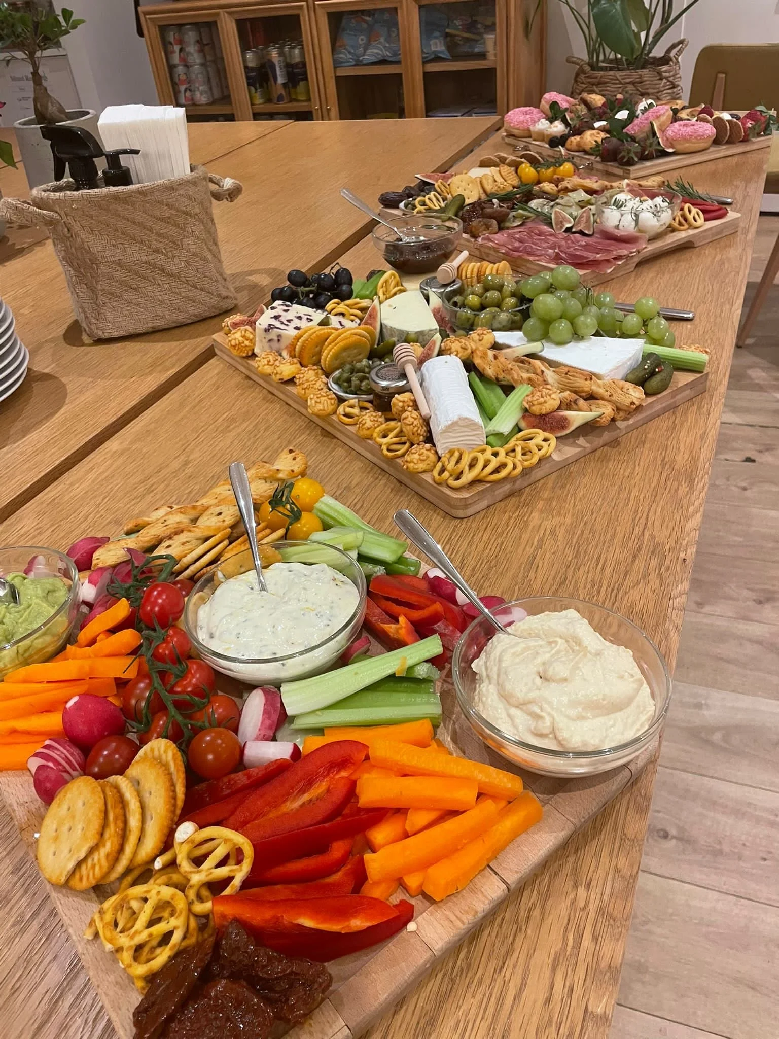 A selection of vegetables including carrots, peppers, celery & radish, with hummus, whipped herby ricotta dip & crackers