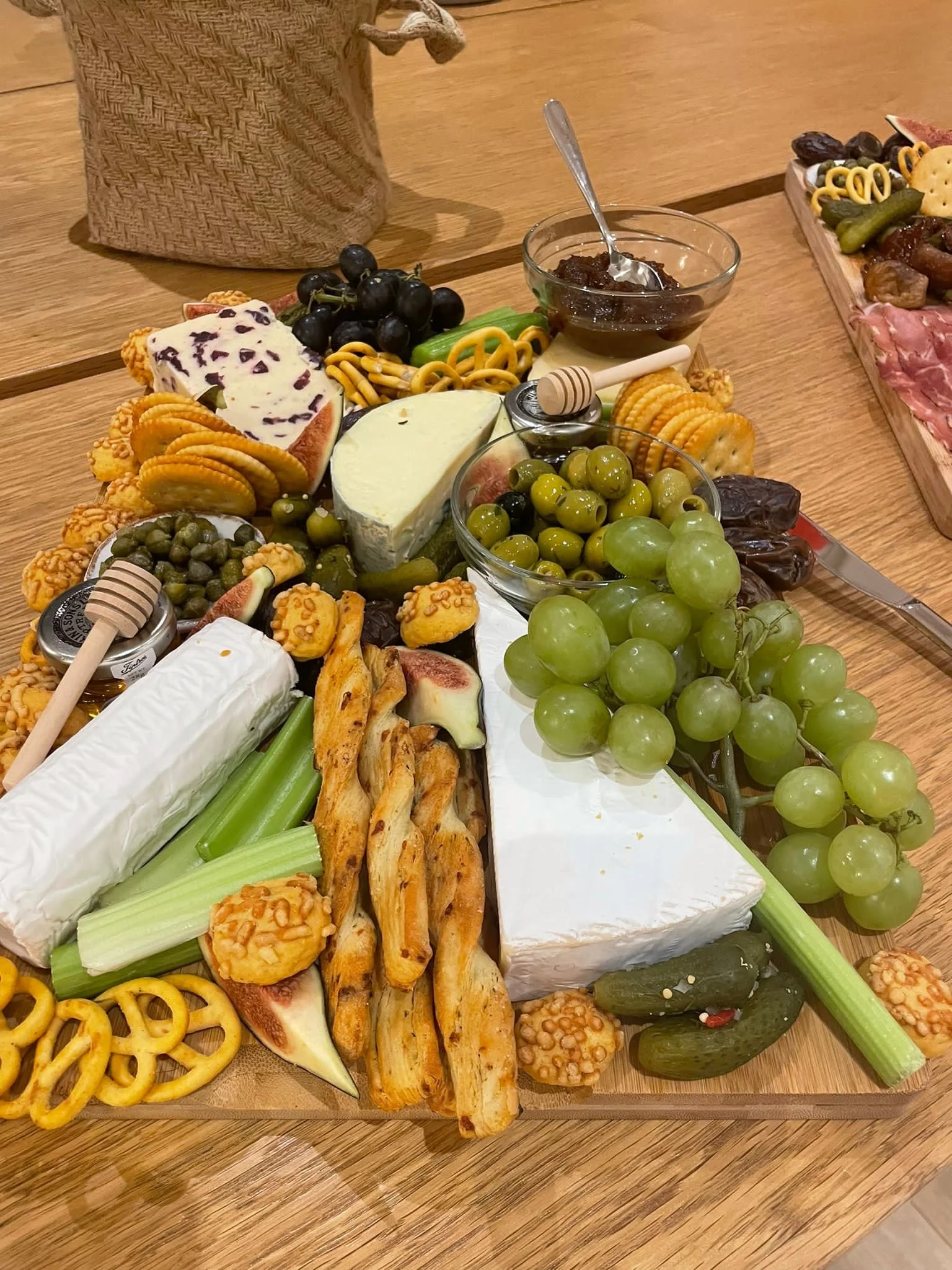 A selection of 5 cheeses, cornichons, caper berries, olives, dried fruit & seasonal fresh fruit, roasted nuts, celery, honeycomb, crackers & chutney