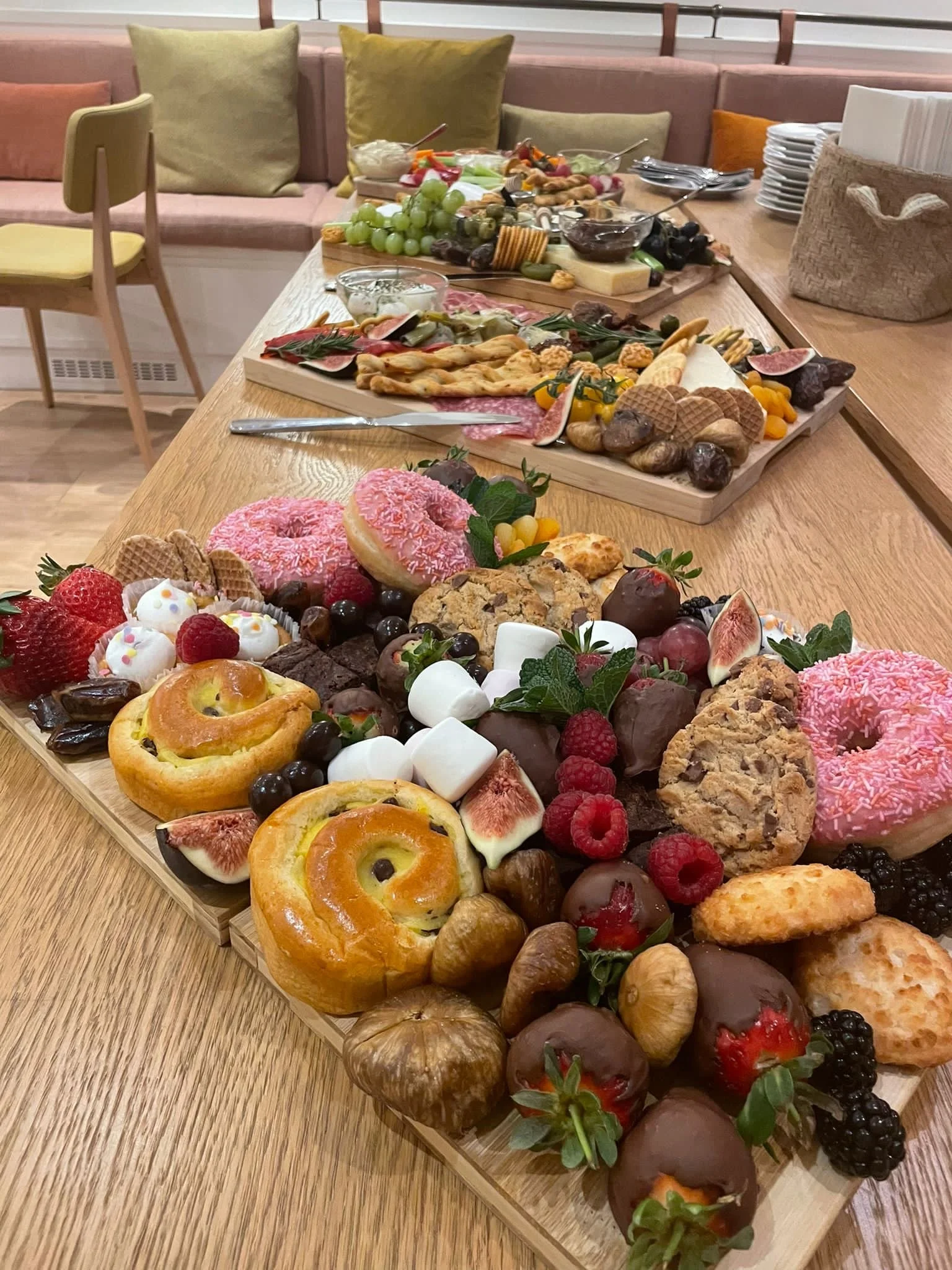 Chocolate brownie bites, chocolate chip cookies, coconut biscuits, cupcakes, doughnuts, brioche, chocolate dipped strawberries & fresh fruit